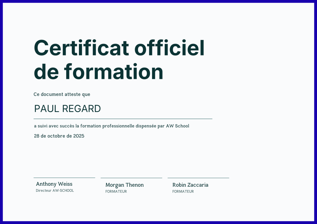 À la fin de la formation, tu reçois un certificat officiel qui vient reconnaître ton travail, ta progression et ta maîtrise des connaissances abordées.